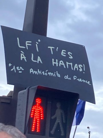 "האנטישמיות הורגת", מכריז שלט בהפגנה, בעקבות המעשים האנטישמיים הנמצאים במגמת עלייה מאז תחילת המלחמה במזרח התיכון. סימון בתים במגן דוד, אלימות נגד יהודים ונסיון רצח בעיר ליון.