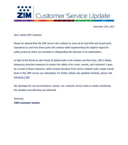 "לאור האיום למעבר בטוח של הסחר העולמי בים ערב ובים האדום, צים נוקטת אמצעים פרואקטיביים זמניים כדי להבטיח את בטיחות הצוותים, כלי השיט והמטען של הלקוחות שלה". כתוצאה משינוי המסלול, ייתכנו עיכובים העלולים להגיע ל-18 ימים באספקת המשלוחים לישראל.