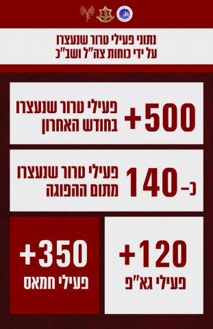 בסך הכל בחודש האחרון נעצרו על ידי לוחמי צה"ל ושב״כ יותר מ-350 פעילים בארגון הטרור חמאס. בנוסף אליהם, נעצרו יותר מ-120 פעילים בארגון הטרור גא״פ. סך הכל נעצרו יותר מ-500 פעילים מארגוני הטרור ברחבי רצועת עזה שנלקחו להמשך חקירה בשטח ישראל.