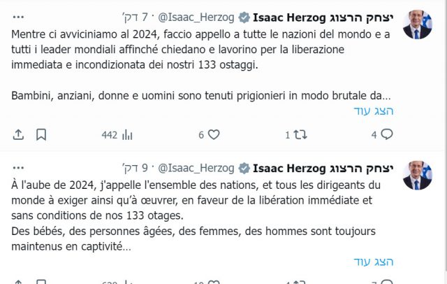 רגע לפני סיום שנת 2023 ותחילת חגיגות השנה החדשה ברחבי העולם נשיא המדינה יצחק הרצוג מפרסם שורת הודעות בעשר שפות שונות עם איחול דומה – שעיקר ההודעה מוקדשת למאמץ לשחרור החטופים ברצועת עזה.