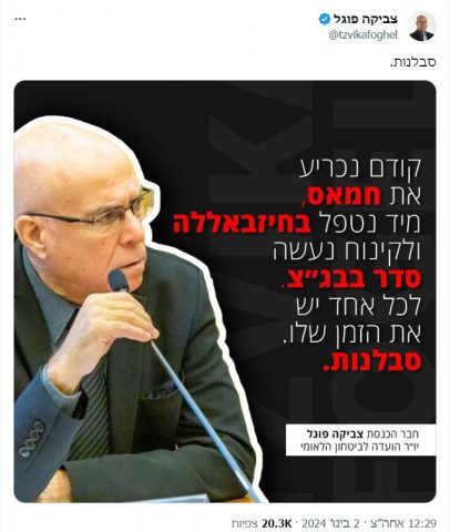 מנגד השר לביטחון לאומי ויו"ר עוצמה יהודית איתמר בן גביר גיבה את חברו לסיעה: "כל מי שחושב שיש השוואה בין בג"צ לחמאס בציוץ של ח"כ פוגל יש לו בעיה בהבנת הנקרא. בשונה מבית המשפט העליון שפרסם פסק דין מקומם וחמור, לא נעסוק ברפורמה תוך כדי לחימה, אבל לאחר המלחמה נשיב את הכוח לרשות המחוקקת, נפסיק בתהליך שבג"צ הפך להיות מחוקק על ונחזיר את השלטון לעם שהוא הריבון".