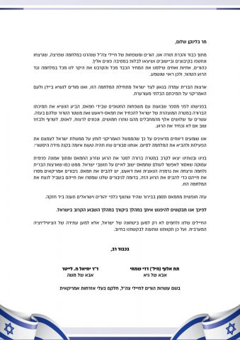 במכתב הבהירו המשפחות למזכיר המדינה כי סיום הלחימה "תהיה טעות איומה בקנה מידה היסטורי", במכתב עליו חתומים אנשים כגון תא"ל במיל' דדי שמחי, ששכל את בנו גיא וד"ר יחיאל לייטר, ששכל את בנו משה, בנוסף למשפחות נופלים נוספות ביניהן גם כאלה בעלי אזרחות אמריקאית שקראו במכתב לממשל האמריקני: ""בנינו ובנותינו יצאו לקרב במטרה למגר את הרוע שזרע חמאס – אנו שומעים דיווחים מדאיגים על כך שהממשל האמריקאי לוחץ על ממשלת ישראל לצמצם את הפעילות ולהביא את המלחמה לסיום" והביעו כי כל עצירה של הלחימה תהיה טרגדיה בקנה מידה היסטורי.