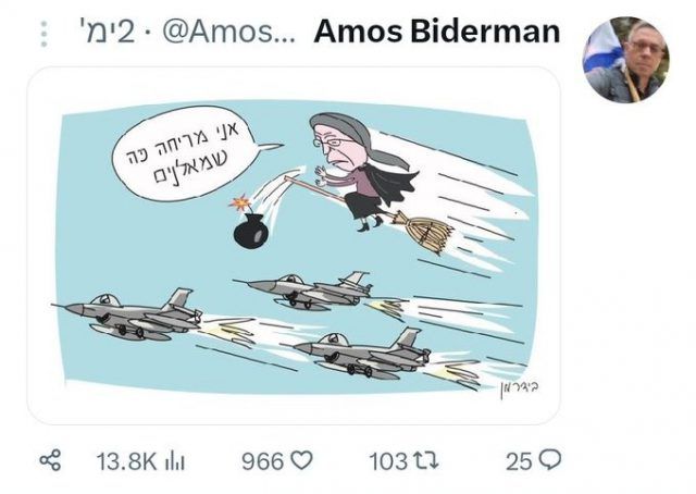 או קריקטורה דומה, רק משלשום, בה נראית השרה אורית סטרוק כמכשפה הזורקת פצצות על טייסים כי "היא מריחה שמאלנים"