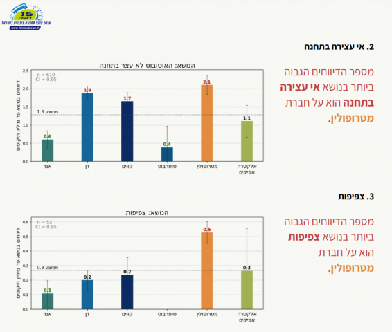 עוד נמסר כי חברת מטרופולין מובילה במספר הדיווחים הגבוה ביותר בנושא אי עצירה בתחנה. התואר המפוקפק שמור לחברה גם במספר הדיווחים הגבוה ביותר בנושא צפיפות.