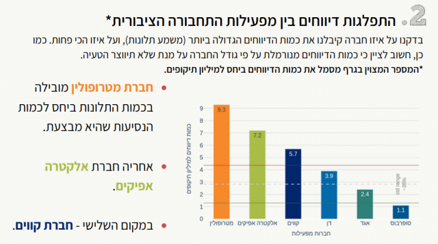 בדו"ח נכתב כי חברת מטרופולין מובילה בכמות התלונות ביחס לכמות הנסיעות שהיא מבצעת. במקום השני ניצבת חברת אלקטרה אפיקים ובמקום השלישי, חברת קווים. לפי התוצאות קו 4 של חברת בית שמש אקספרס נמצא במקום הראשון בכמות התלונות הגבוה ביותר, אחריו קו 249 של חברת מטרופולין.