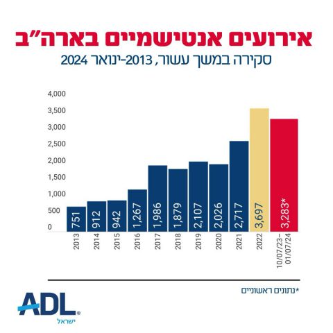 על פי נתונים ראשוניים שהתקבלו מהליגה נגד השמצה, בשלושת החודשים שחלפו מאז מתקפת ה-7 באוקטובר בישראל, מספר התקריות האנטישמיות בארה"ב עלה דרמטית, על פי הנתונים שנאספו תקריות אנטישמיות התרחשו יותר מפי שלוש מהממוצע לפני המתקפה על ישראל.