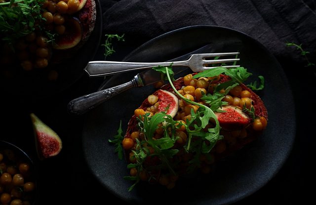קולים את פרוסות הלחם ומניחים בצד. מסננים את גרגירי החומוס ומפזרים על מגש אפייה. מתבלים במלח ופלפל לפי הטעם, קליפה ומיץ מהלימון, תימין טרי וקצת שמן זית. אופים ב-200 מעלות במשך 15 דקות ואז חותכים את התאנים לרצועות ומניחים על הלחם. מפזרים מעל גרגירי החומוס ואת עלי הרוקט, ומוסיפים שמן זית כתית, חומץ ומלח. ניתן להוסיף קוביות טופו או אגוזים.