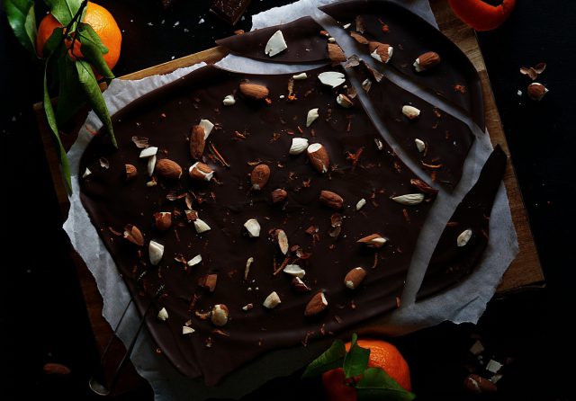 ממיסים את השוקולד בבן מארי עם קליפת התפוז ומורחים על נייר אפייה. משתדלים שהשוקולד לא יהיה דק מדי בכדי שלא יהיה שביר. מפזרים מעל את השקדים הקלויים והמלח ומקררים במקרר עד שהשוקולד מתקשה לחלוטין. ניתן להוסיף תוספות נוספות לפי בחירה, כגון: אגוזי פקאן, פירות מיובשים, חתיכות עוגיות או שבבי קוקוס וגרנולה.