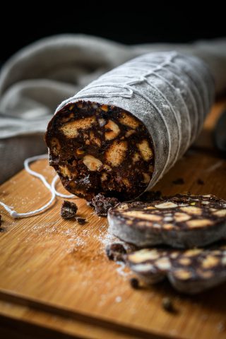 מערבבים את העוגיות והאגוזים בתערובת השוקולד והחמאה המומסים. פורסים ניילון נצמד גדול, יוצקים עליו את התערובת ומגלגלים לצורת צינור. מסובבים את הצינור על עצמו וקושרים את הקצוות באמצעות חוט כדי להבטיח שהוא הדוק. מאחסנים במקרר למשך לפחות 6 שעות. מסירים את הניילון ומפזרים אבקת סוכר. חותכים רשת בישול וקושרים סביב הצינור, בדומה לעישון בשר. בעת ההגשה, חותכים את הצינור בעזרת סכין חדה עם להב חלק, שטבול במים חמים.