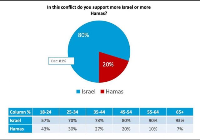 על פי נתוני הסקר שפורסמו בימים האחרונים, ישראל זוכה לתוצאות תמיכה משמעותיות, ובניגוד לסקרים קודמים, זוכה לרוב בכל פלחי הגילאים, גם אלו הצעירים ביותר 18-24. כאשר בכלל הסקר זוכה ישראל באופן ישיר ל-80% תמיכה מכלל הציבור האמריקאי ומצביעי הבחירות לנשיאות.