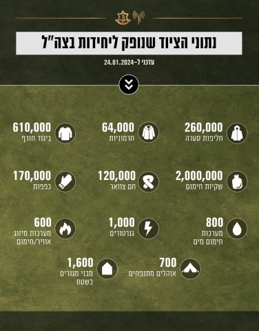 במסגרת ההיערכות של צה"ל לחורף נופקו עד כה מיליוני פריטים וציוד אישי ליחידות השוהות בכלל הגזרות בארץ ובתמרון, בדגש על מוכנות לשהייה ממושכת של הכוחות בשטח. זאת, על מנת לאפשר רציפות תפקודית לכוחות הנמצאים בשטח זמן רב.