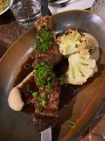 בשביל ללכת על בטוח לקחנו גם שיפוד פילה עגלה, שמגיע על מצע של קרם שורשים וכרובית אפויה. במנה זו, בדומה למספר מנות רגילות נוספות בתפריט, ניתן לקבל גם תוספת בצד. האורז הבסמטי מלא בעשבי תבלין שקצת מאפילים עליו ולכן אם אתם רוצים ללכת על בטוח, תוספת ההום פרייז אף פעם לא מאכזבת עם טעם פשוט של צ'יפס.