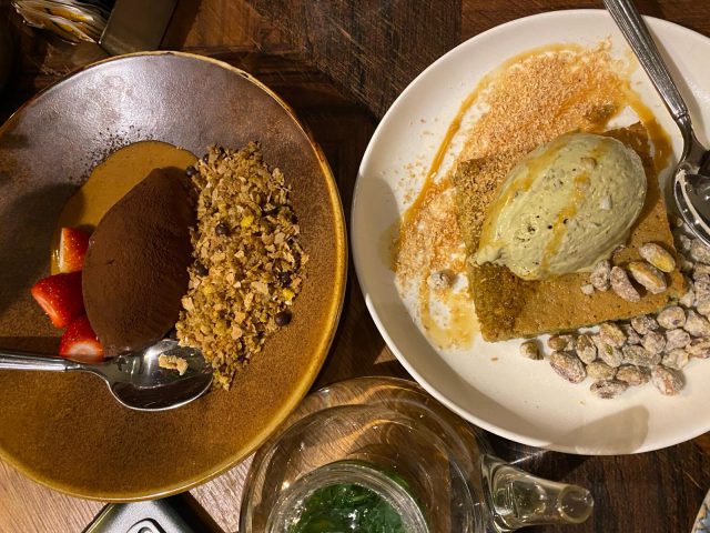 בגזרת הקינוחים המבחר לא רחב, שכן יש רק שני קינוחים: קרמו שוקולד עם רוטב אגוזי לוז, קורנפלקס ותותים, ועוגת פיסטוק עם גלידת פיסטוק מעל וקוקוס קלוי. קינוח השוקולד דחוס וקרמי ושונה מאוד מקינוחי השוקולד הקלאסיים כמו עוגה חמה ומוס, ולכן קשה יותר כשהוא יורד בגרון, כך שאם אתם אוהבים פיסטוק מומלץ ללכת על העוגה החמימה שמשתלבת מעולה עם הקוקוס בצד והקור של הגלידה מלמעלה.