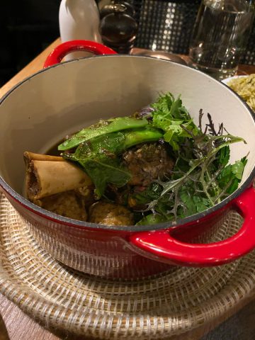 מנת אוסובוקו הטלה מוגשת בצורה מרשימה, כאשר הסיר (הכבד מאוד) הונח ישירות על השולחן לפנינו. הבשר היה רך במיוחד וירד בקלות מהעצם, והקניידלך אמנם היו טעימים אך הרגישו מרוכזים מאוד, ופחות הקניידלך הרגילים שאנחנו מכירים מבית אמא. פילה העגלה הגיע על שיפוד כמו במסעדת בשרים רגילה, וגם הוא היה רך וטעים כמו שבשר צריך להיות.