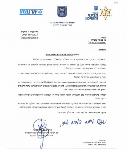 במכתבו פנה השר אל ראש הממשלה נתניהו והסביר כי כבר לאורך לפחות שבועיים מבקשים במל"ל דחיות לפני תחילת קידום החוק, וכי חשיבות החוק והקביעה כי אונר"א היא חלק פעיל בפעילות חמאס חשובה באופן עכשווי, ועל כן אין פשר בהמשך העיכובים המדוברים.