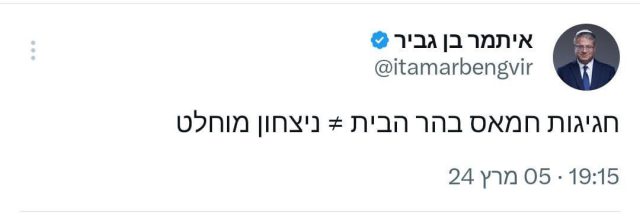 השר בן גביר הוסיף ופרסם ברשתות החברתיות עקיצה לסיסמא המלחמה של ראש הממשלה נתניהו, אחרי ההחלטה על ההתנהלות בהר הבית.