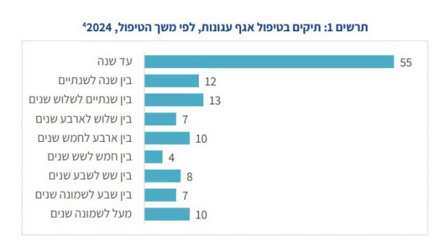 מנתוני התרשים עולה כי 44% תיקי העגינות הפתוחים נמצאים בטיפול אגף העגונות פחות משנה ויותר למחצית התיקים (53%) מטופלים עד שנתיים; קרוב לשליש מהתיקים מטופלים באגף מעל לארבע שנים ורק 8% מטופלים מעל לשמונה שנים.