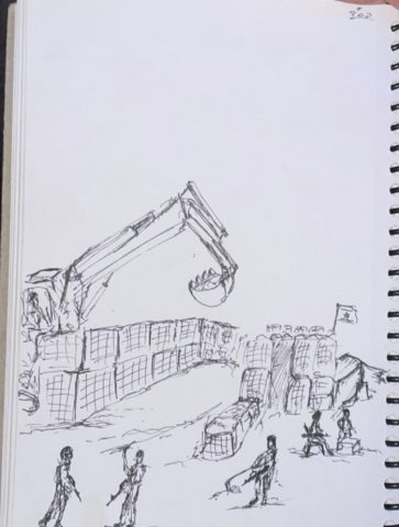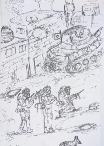 לוחם המילואים חיים לוי חיימון מגוש עציון צייר את אירועי המלחמה בעזה מנקודת מבטו. חיימון בן 29, נשוי ואב לשלושה, מדריך טיולים והדרכות שטח. שירת כ- 3 שנים כלוחם חוד בגד״סר צנחנים. בשירות המילואים, לוחם בפלס״ר 6646 של חטיבה 646 עוצבת ״שועלי מרום״, חטיבת המילואים האחרונה שיצאה מעזה.