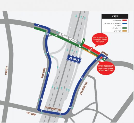 במהלך עבודות הלילה לא תתאפשר נסיעה ברחוב ביאליק לנוסעים לכיוון מערב, בקטע שבין דרך מנחם בגין לבין גשר ההלכה והירידה לאיילון צפון· לא תתאפשר הפניה שמאלה מדרך מנחם בגין לרחוב ביאליק· הירידה לאיילון צפון תתאפשר לנוסעים בכיוון מזרח בלבד. לנוסעים בכיוון מערב הירידה לאיילון צפון תתאפשר ממחלף רוקח וממחלף השלום