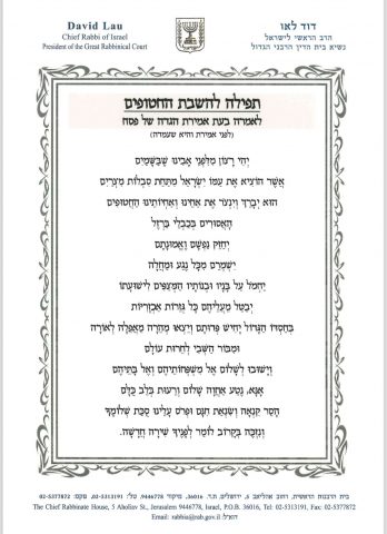 "על כל אחד מאתנו מוטלת חובה קדושה לחוש את צער זולתו ולייחד תפילה מיוחדת דווקא באירוע מכונן של אמירת הגדה של פסח, ולהזכיר ולהתפלל עבור אותם חטופים הנמצאים כעת בצרה ובשביה". אל מכתבו של הרב הראשי מצורף סדר התפילה שחיבר הרב לאמרה בעת אמירת הגדה של פסח לפני 'והיא שעמדה'. "בתפילה שישמע קול תפילותינו, ויושבי חושך ואסירי ברזל יצאו מאפילה לאורה, ונזכה לחג פסח כשר ושמח".