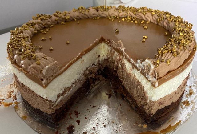 אחרי שראינו את העוגה הזו, הבנו את הביטוי "לאכול עם העיניים". העוגה המרשימה מבחוץ, מרשימה עוד יותר מבפנים עם שכבות רבות הכוללת עוגת שוקולד פאדג', קרם נוטלה, קראמבל שוקולד ונוגט וקרם וניל, עם מעטפת של קרמל מלוח וגבישי שוקולד מוזהבים.