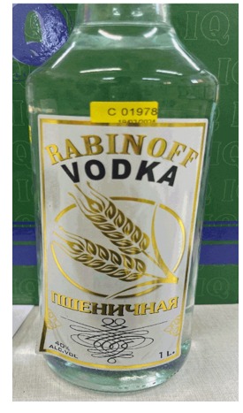 וודקה מסוג RABINOFF VODKA, תכולה 1 ליטר, כוהל 40%. המוצר מכיל ריכוז של בוטנול שלישוני. המוצר נדגם מחנות "מחסני השתיה", רחוב היצירה 6, בית שאן.