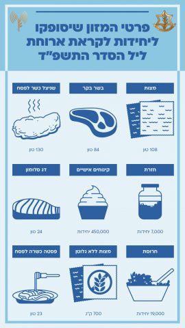 על פי הודעת דובר צה"ל, אגף הטכנולוגיה והלוגיסטיקה, בהובלת חיל הלוגיסטיקה ומרכז ההספקה המטכ״לי (המרה״ס), נערך להספקת פריטי מזון מגוונים לארוחות החג בבסיסי צה"ל בכל הארץ וללוחמים ברצועת עזה. מנהלי המטבח בכלל היחידות שוקדים על הכנת תפריטים עשירים ומותאמים לצרכי החיילים, תוך התחשבות באוכלוסיות השונות.