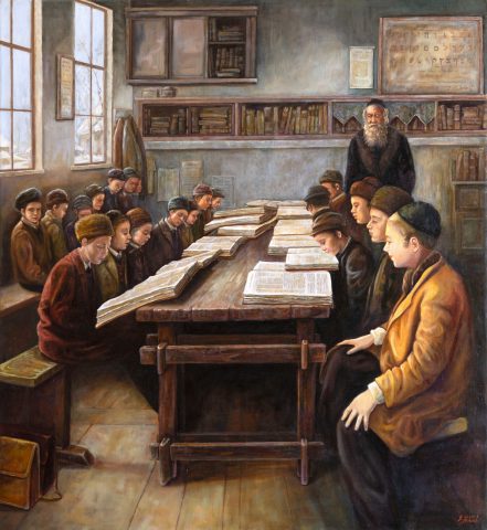 (יהודים לומדים בחיידר בפולין במאה ה-19, ציור של ריקי יעקובוביץ')