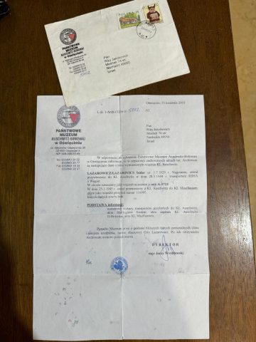 (המכתב מאושוויץ שמתעד את הגעתו של יצחק לזרוביץ' למחנה)