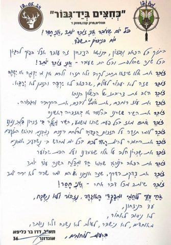 אחי ורעי, לוחמי ומפקדי האוגדה, נזכור ולא נשכח, עד הניצחון, לא ניסוב לאחור,מאוחדים, לא נישבר, לעולם לא נשכח ולא נוותר. ברעות לוחמים, תא"ל דדו בר כליפאאוגדונר 36", סיים את מכתבו.