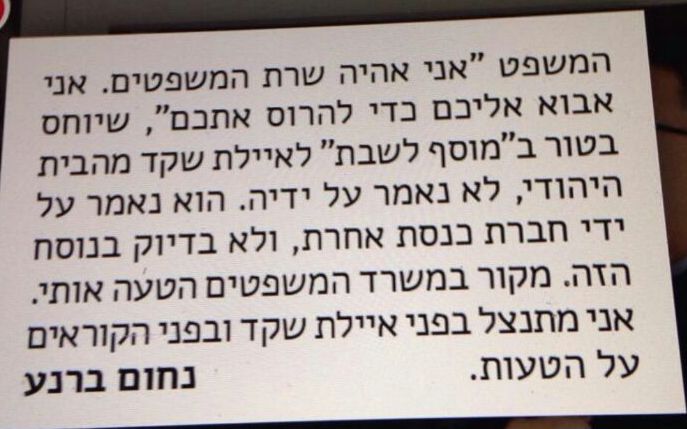 הבוקר (א') מפרסם ברנע בעיתונו התנצלות בה הוא מודה באשמה ומטיל אותה על מקורתיו (אותם לא בדק): "המשפט "אני אהיה שרת המשפטים. אני אבוא אליכם כדי להרוס אתכם" שיוחס בטור "מוסף לשבת" לאיילת שקד מהבית היהודי, לא נאמר על ידיה. הוא נאמר על ידי חברת כנסת אחרת, ולא בדיוק בנוסח הזה. מקור במשרד המשפטים הטעה אותי. אני מתנצל בפני איילת שקד ובפני הקוראים על הטעות. נחום ברנע"