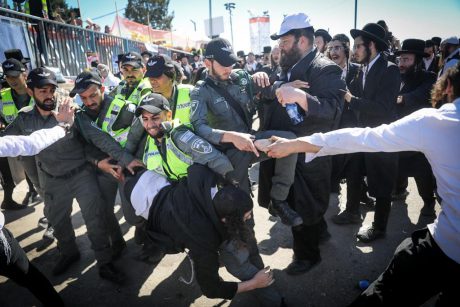 ל"ג בעומר תשפ"ד. לאחר יממה רוויה בחיכוכים בין חרדים רבים שהסתננו להר מירון לאחר איסור העלייה בעקבות המצב הביטחוני, בשעות האחרונות עלתה רמת האלימות מצד השוטרים, אחד השוטרים תועד מטיח יהודי מבוגר לעבר הרצפה ופותח לו את הראש.