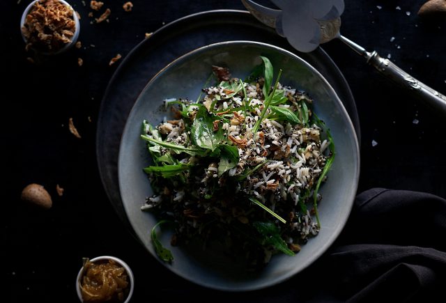 מרתיחים את הקינואה השחורה ואת האורז הבסמטי בסירים נפרדים ומוסיפים מלח. לאחר ששניהם מוכנים, מצננים אותם במהירות במים קרים ושומרים אותם בצד למועד מאוחר יותר. קולפים וחותכים את הבצל ומבשלים אותו עם שמן זית וקורט מלח. כאשר הבצל מזהיב, מוסיפים את החומץ ומבשלים עד שהוא מתאחה יחד עם הבצל.