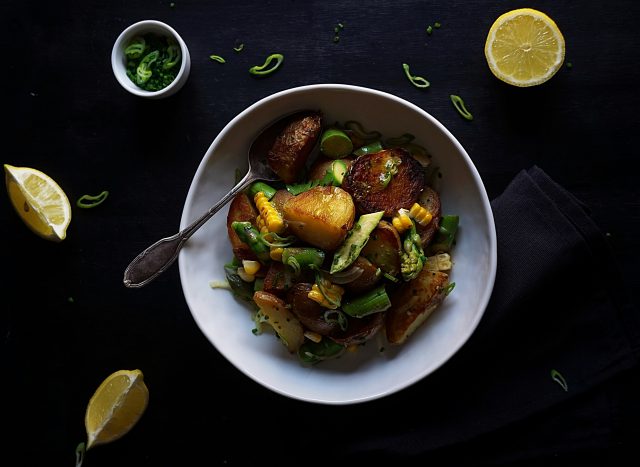 מחממים שתי כפות שמן בסיר ומבשלים את תפוחי האדמה עד להזהבה, ומניחים בצלחת. מטגנים את הפלחי תירס ומניחים על נייר סופג. חותכים את הבצל האביבי לרצועות, לוקחים את גרעיני התירס ומוסיפים לצלחת תפוחי האדמה. מוסיפים מלח ופלפל, קוצצים את עשבי תיבול הטריים ומוסיפים את גרידת הלימון.