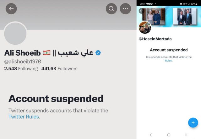 באיחור של שנים ולפחות ששה חודשים, הרשת החברתית טוויטר (X), חסמה את חשבונותיהם של כתבי חיזבאלה עלי שועיב וחוסיין מורטאדה.