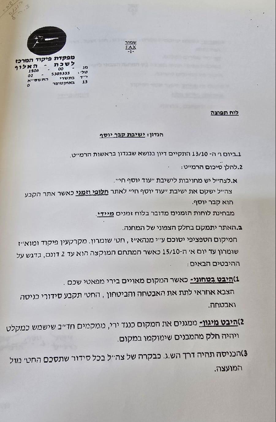 הלילה נשלח המסמך ללשכת ראש הממשלה, בליווי דרישה רשמית מרבני הישיבה לקיים את ההתחייבות ולהשיב את הישיבה למקומה המקורי. "אנו מצפים שצה"ל ומדינת ישראל יעמדו בהתחייבותם, ונשוב לנוכחות קבועה בקבר יוסף", נאמר בפנייה.