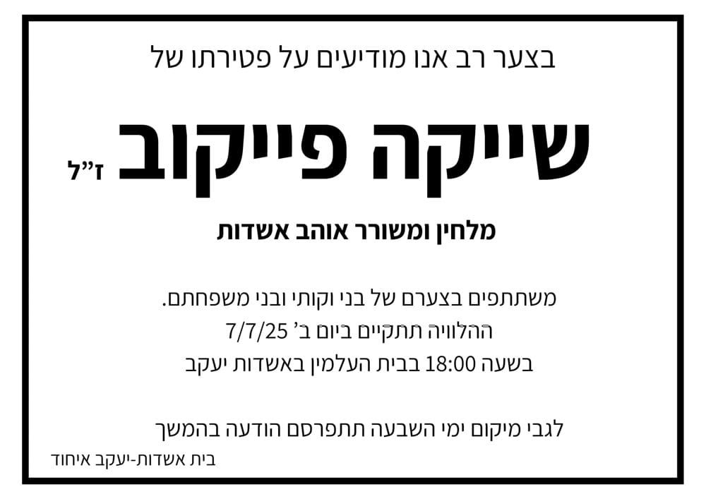 ברוך דיין האמת. המוזיקאי, המלחין והפזמונאי הישראלי שייקה פייקוב, נפטר היום (ראשון) בגיל 88. פייקוב, דמות מרכזית בזמר העברי, הותיר אחריו מורשת עשירה של שירים שהפכו לחלק בלתי נפרד מהתרבות הישראלית. הלווייתו תתקיים מחר (שני), ה-7.7, בבית העלמין באשדות יעקב, בשעה 18:00.