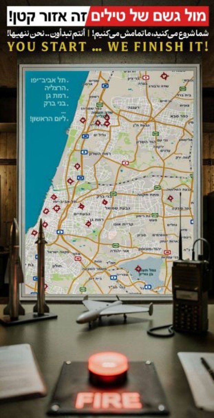 לפני זמן קצר האיראניים חשפו איום חדש מלב טהראן ישירות אל לב ישראל, בשלט ענק שנתלה בכיכר נרשם האיום בעברית "מול גשם של טילים, זה אזור קטן!" כאשר תחתיו מוצגת מפה של מרחב גוש דן, בנוסף נכתב בשלט באנגלית, במה שנראה כרמז לאמריקאים "אתם תתחילו, אנחנו נסיים!".