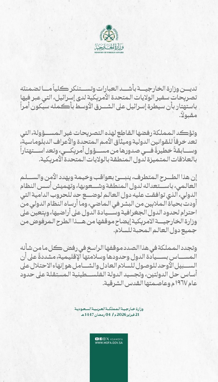 כעת, משרד החוץ הסעודי מפרסם הודעת גינוי תמוה אל דבריו של האקבי, במה שנראה כמתרעמות מתוכננת ומבויימת. משרד החוץ הסעודי מסר: "משרד החוץ מגנה בכל תוקף ומתנער לחלוטין מהצהרותיו של שגריר ארצות הברית בישראל, בהן טען בביטול כי שליטה ישראלית על המזרח התיכון כולו תהיה דבר מקובל".
