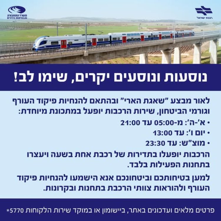 רכבת ישראל ממשיכה להפעיל את קווי הרכבת במתכונת חירום בימים א' עד ה' בין השעות 5:00 ל- 21:00 בקירוב, ובימי שישי עד השעה 13:00 בקירוב. במוצאי השבת תפעל הרכבת עד השעה 23:30 בקירוב,