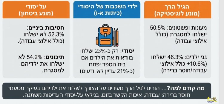הנתונים מראים כי ככל שהילדים קטנים יותר מעונות וגני ילדים ההורים מוכנים לשלוח את הילדים למסגרות גם בשל אילוצי עבודה (50.5% בקרב הפעוטות ו46.3% בקרב גני הילדים). מנגד למעלה ממחצית ההורים בחינוך העל יסודי אמרו כי לא ישלחו את ילדיהם לבתי הספר. בחינוך היסודי רק 23% מההורים ישלחו את הילדים.